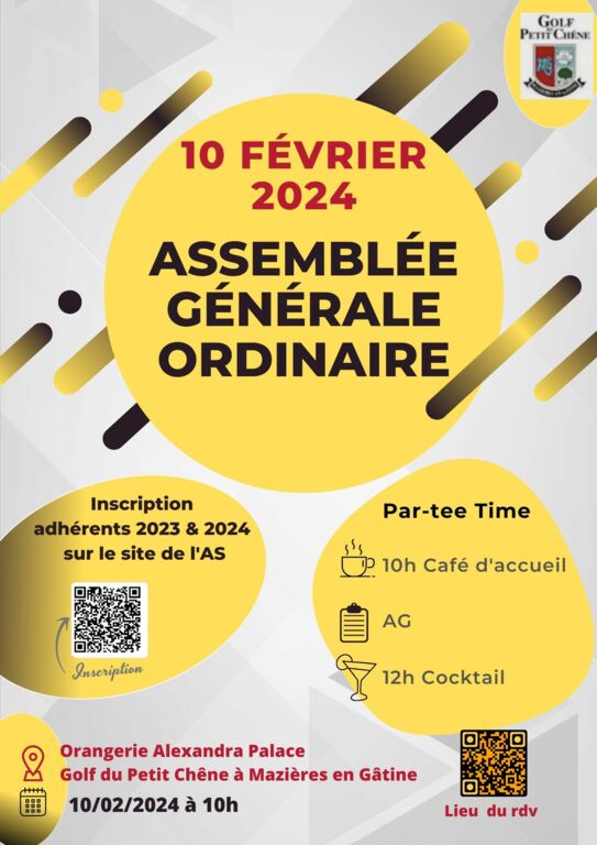 Nous avons le plaisir d'inviter les membres de l'AS 2023 à participer à l’Assemblée Générale Ordinaire de l’Association Sportive du Golf du Petit Chêne qui se tiendra le samedi 10 février à 10h dans l'Orangerie de l'Alexandra Palace, à Mazière-en-Gâtine